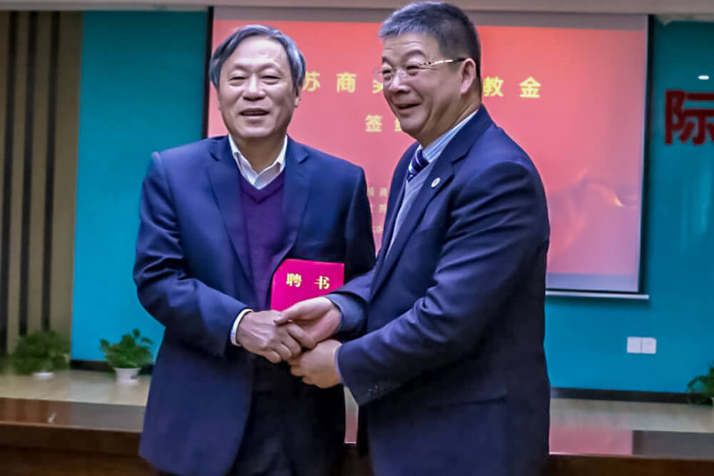儀式上江蘇商貿職業(yè)學院正式聘請陳家俊董事長為客座教授,并頒發(fā)了聘書。
